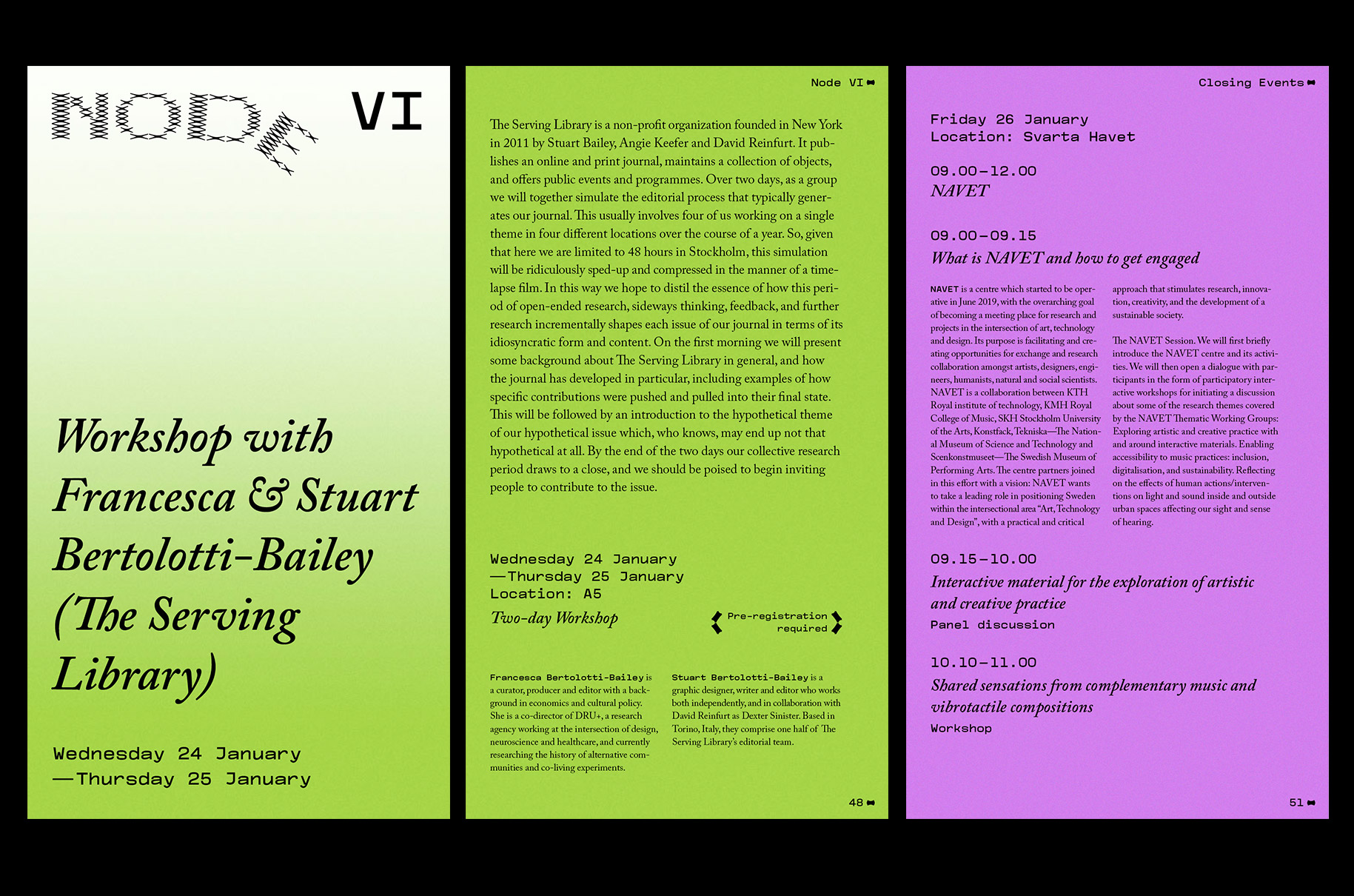 The bespoke typefaces used in the titles are built from shapes and ornaments that are combined into letters, formed into words, to then rebuild again—to reflect the ongoing processes and projects throughout the week. The digital booklet uses four colors that change throughout the publication to invite us to follow the different parts of the programme.